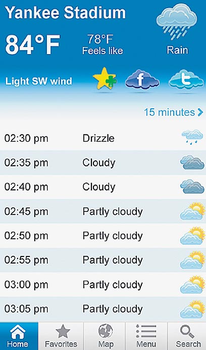 האפליקציה, המיועדת להורדה לאייפון ולמכשירי אנדרואיד, תאפשר לדעת לא רק האם ומתי כדאי לצאת מהמשרד לספל קפה או מתי והיכן לתכנן פיקניק ספונטני, אלא גם מתי בדיוק אפשר יהיה להוציא את הכלב לטיול, או להזהיר את הילדים להגיע הביתה לפני רדת הגשם. יותר מזה: ניתן גם לדעת מהי רמת העננות ומהי עוצמת הרוח הצפויות בכל דקה ודקה במהלך ריצת הבוקר.