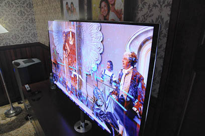 בסיום מסיבת העיתונאים, שלפה LG את המסך המסקרן ביותר שלה - טלוויזית OLED בגודל 55 אינץ' בעובי 4 מילימטר. איך הוא נראה בפועל? גוף דק דק, תמונה בוהקת ורושם כללי מהמם. הקהל מסביב התגודד ללא הרף סביב המסך ובאוויר ריחפה תחושת "הדבר הבא".