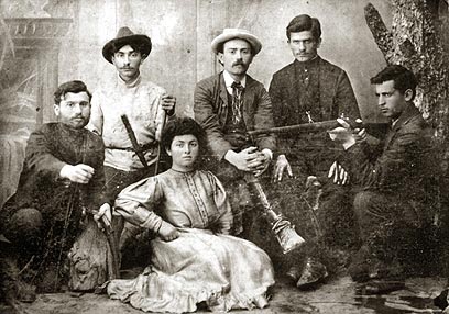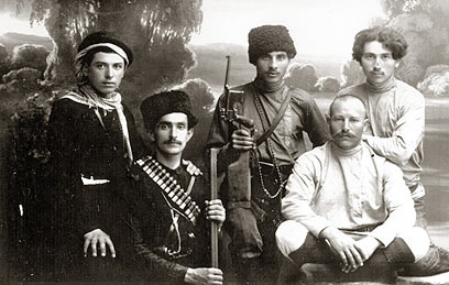 3. כזכור מהכתבה הקודמת, אברהם ואחיו יצחק התגייסו להגנה על קהילת ישראל בברדיצ'ב כנגד הפוגרומים שם בראשית המאה העשרים. גם כאן בארץ היה מעורב אברהם בעשייה הביטחונית. בשנת 1911 הגיע לארץ יצחק אחיו הוא מצטרף לארגון השומר. בתצלום יצחק (עם חגורת כדורים) בין חברי השומר, מימין: יחזקאל חנקין, מאחור: מאיר ספקטור, שאול מאירוב, ומנחם.