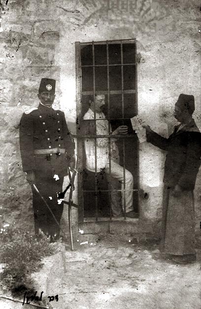אלדמע הסכים מיד. לרוע המזל כאשר הגיעו לארץ, נפל המטען בנמל יפו והשוטרים התורכים מצאו נשק. עצרו את אלדמע, אבל לעזרו בה הקונסול הרוסי (לאלדמע הייתה נתינות רוסית) וטען שאלדמע צריך להיות במשמורת רוסית בבית המעצר בחצר הקונסוליה בירושלים. בתצלום: אלדמע מאחורי סורג ובריח במגרש הרוסים. כחצי שנה היה במעצר. הוא מאוד התחבב על העצורים בגלל שמחת החיים שלו ונגינתו בקונצרטינה.
