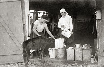 אברהם לא התווכח, לקח את חפציו וירד להתגורר במרתף הבית. אותה יפהפיה מהחלונות, זהבה יודילוביץ, היתה לימים אשתו. בתצלום: משק הפועלות, זהבה מימין בלבן.