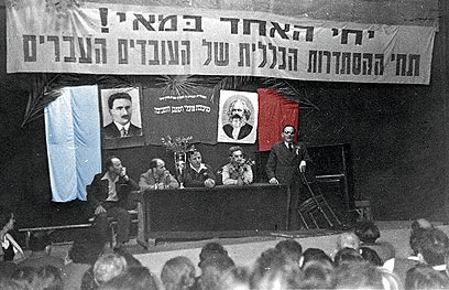 17. זלמן שזר נואם בכינוס אחד במאי בחצר אלדמע. הדקורציה מעשה ידיו של אברהם אלדמע.