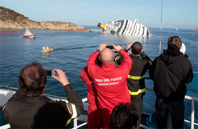 תאונת השיט - מעכשיו אטרקציה לתיירים. מאות תיירים עמוסי סלי פיקניק ומצלמות הגיעו בימים האחרונים לאי הקטנטן האי גיגליו שליד חופי טוסקנה, כשהם צופים בשרידיה של אונית השיט "קוסטה קונקורדיה" שעלתה על שרטון בשבוע שעבר.