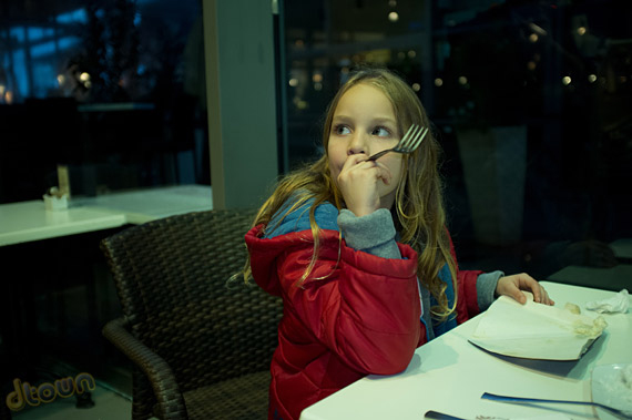 כאן בתמונה של מיה המבזק על מילוי אוטומטי, עבד יפה. איזון לבן אוטומטי מתקשה להתמודד עם הגוון הירקרק האופייני לנורות פלורסנט, אבל זה ניתן לתיקון בנגיעה קלה ב- Lightroom. הנה התוצאה: