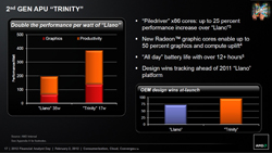 AMD חושפת את ביצועי ה-Trinity, כחלק מהגילוי הנאות שלה אנשי מפתחת השבבים הציגו בפני פוקדי מפגש האנליסטים השנתי רפרנס של מחשב נייד דק (עובי של 18 מילימטרים) וקל מבוסס מעבד Trinity שיוצר בידי מרכיבת המחשבים הניידים השניה בגדולה בעולם, Compal הטאיוונית. לא הרבה ידוע על הדגם הספיציפי שהוצג, אך בחברה דיברו על טווח מחירים של "פחות מ-900 דולר" עבור מכשירים שכאלו ועל אורך חיי סוללה טוב יותר מזה של המתחרים – ניתן לכם לנחש לבד על מה ועל מי מדובר.