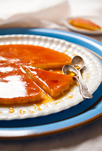 6. ההגשה: מניחים על התבנית צלחת הגשה גדולה והופכים בזהירות, כדי שהקרם יתהפך והסירופ יהיה למעלה. כשהופכים נוטף קצת סירופ לשולי הקרם. חותכים למנות כמו שחותכים עוגה, ומגישים משולשי קרם עם קרמל.