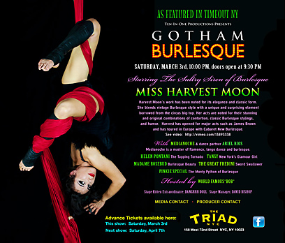 אמנות הבורלסק – מופעי לילה קאברטים וקרקסים המשלבים הומור, כישרון וזימה – מרתקת את ארה"ב כבר כמה מאות טובות. ביום שבת הקרוב יש לכם הזדמנות לחוות על בשרכם את החוויה עם מופע "גות'אם בורלסק" שיתקיים במועדון Triad. את הערב תוביל הארווסט מון, אמנית בורלסק שמשלבת אלמנטים קרקסים ומודרנים בהופעתה. בנוסף, יופיעו בערב רקדני סטפס ופלאמנקו, בולעי חרבות, נערות זוהר ולהטוטני אש. מבטיחים לנו מסיבה שמחה וצבעונית במיוחד.