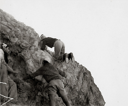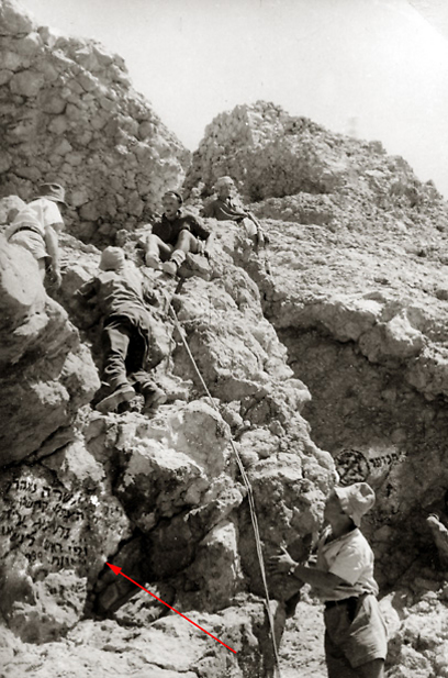 "החילונו לטפס. הגענו תחילה כולנו עד הצוק ושאר הבחורים יורדים כמה פעמים ומביאים את צרכי המזון וכו'. כעת מחכים בצל הצוק להכנת הדרך. עולים בעזרת חבל למעלה, רואים נוף נפלא של כל ים המלח והלשון והמדבר היפה בין מסדה לים. רואים למטה, מסביב למסדה, את הדייק שהקימו הרומאים ואת מחנות הרומאים ממזרח ומערב להר. במסדה יש שרידי השער, החומה ושרידי כמה בתים.