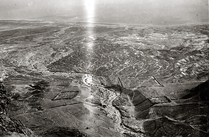 13. מבט מראש מצדה מזרחה לכיוון ים המלח. נראים שלושה מתוך שמונת המחנות הרומאים שנבנו במהלך המצור, וקטע מהדייק שהקיף את מצדה.