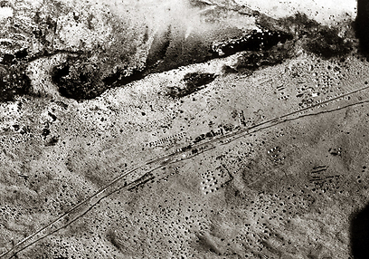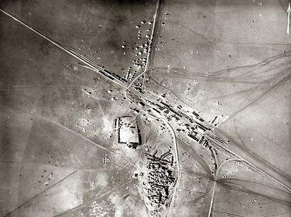12. תצלום אוויר, 1917. מהנדסים בריטים בונים את מסילת הרכבת אל עריש-רמלה
