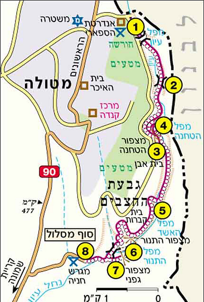 נעבור ליד בית הקברות שבו טמונים ראשוני מטולה, על גבעת החצבים, ונגיע אל נקודה מדרום לבית העלמין הצופה על מפל התנור (6). הירידה תלולה ומפותלת, ובסוף האביב גם מבושמת באחירותם. בסופה נפנה שמאלה אל מפל התנור שגובהו 30 מ' והוא צונח אל תוך בריכה עמוקה הסגורה מצדדיה.