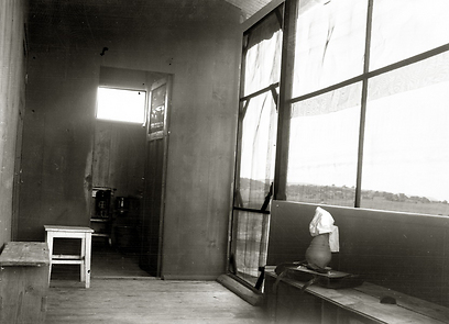 18. מראה מבפנים לקליניקה של ד"ר אלקן בנחלת יעקב (צריף עם גג פח. כדי להפיג את חום הקיץ ייצרו חלון גדול עליו רשת נגד יתושי הקדחת, על הספסל ג'ארה למים צוננים)
