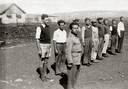 20. כיתת ההגנה בפיקוד ברלינסקי: מימין: לא מזוהה, מרדכי פינשטיין, שאול לוזינסקי, זלמן שיינקין, יצחק שניידוביץ, שלמה פינשטיין, אברהם גולובוב, זליג הנוטר וקרפל קנציפולסקי, בחזית ברלינסקי