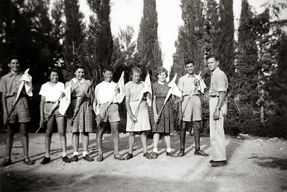 18. איתות דגלים, מימין: יוסף גולדברגר המדריך, איציק גולדברגר, ציפורה אולשה, רותי לוזינזקי, אשר גולובוב, בתיה פיינשטיין, זמירה בקמן, יוסי כץ, שנות ה-40 בחצר ביה"ס