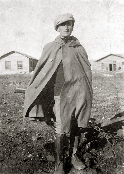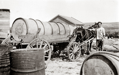 6. בעטרות: כך הובילו מים עם חביות מבורות מים של ערבים בסביבת הישוב. יעקב סגל ליד העגלה