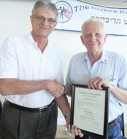 העיתונאי הותיק אהרון ברנע, שליח ערוץ שתיים של הטלוויזיה הישראלית בארה"ב, התארח ב"פרלמנט הריביירה". ברנע, טעון כרימון ממפגשיו עם מנהיגים בולטים בעולם הערבי, במסגרת עבודתו ככתב לענייני ערבים, סיפר לחברי הפרלמנט, חוויות ממפגשים עם סדאת, מובארק, אסאד ועראפת, מנהיגים אחרים והמפגש הטראומתי עם קדאפי. בסיום דבריו ענה לשאלות חברי הפרלמנט בנושאים אקטואליים כגון יחסו של הנשיא אובאמה כלפי ישראל, האפשרות לשחרורו של פולארד, וקינח באנקדוטות מחוויותיו כעיתונאי. חלקו השני של הדיון הפרלמנטרי הוקדש לטקס מרגש לזכר חללי מערכות ישראל. יורם אדר, מנחה הטקס, הזמין בזה אחר זה את חברי הפרלמנט, אשר סיפרו את המפגש שלהם עם משפחות השכול. החזן- הרב, עורך הדין, אברהם פרי קרא את תפילת "אל מלא רחמים". פיני דגן, מבכירי חברי הפרלמנט, דיבר על הנופלים ועל החשיבות של השתתפות הקהילה בטקס יום הזכרון הממלכתי. הטקס ננעל בשירי לוחמים.