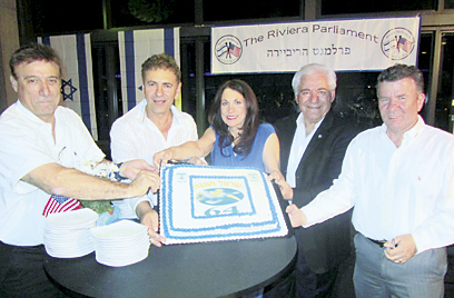 שעה קלה לאחר צאת השבת, הגיעו חברי "פרלמנט הריביירה", "פורום הנשים" וחברי "השמיים הם הגבול" למסעדה ומקום האירועים "בריזה", כדי לחגוג מסיבת עצמאות שישים וארבע לישראל. חברי וועדת התוכן של "פרלמנט הריביירה", בראשותם של בני הזוג אורית ודורון פייגלמן, יחד עם בועז טפר, הבעלים של המסעדה היפיפיה, עמלו שבועות על תכנון המסיבה, והם אכן ראו שכר לעמלם. "בריזה", המסעדה ומקום האירועים, התמלאה חיש קל עד אפס מקום, על ידי כמאתיים וחמישים חוגגים, שהגיעו לבושים בכחול ולבן ונהנו מארוחת ערב עשירה מבית היוצר של השף דוד אסרף, תאווה לחך ולעין. את הערב פתח נשיא הפרלמנט, אמנון גרשוני, אשר בירך את הנוכחים, דורון הקריא קטע על המדינה ועצמאותה. לאחר הקרנת סרטון הכרזת המדינה, שרו כולם את "מגש הכסף", של אלתרמן.