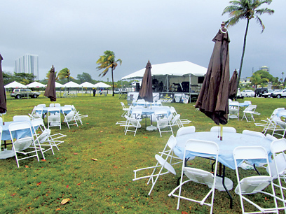 עשרות פגישות, אין ספור תיאומים ותכנונים, ירדו לטימיון בעקבות מזג אויר גשום, אשר בעטיו בוטל הפסטיבל לרגל יום העצמאות השישים וארבע של מדינת ישראל. האירוע המרכזי שאורגן על ידי "ליגת הידידות פלורידה-ישראל" בשיתוף עם הקונסוליה הכללית, היה אמור השנה להיות גדול במיוחד. איתן פניאס, מחברת הדקורציה "אמזינג איבנטס", עמל בלילה שקדם והעמיד למעלה משישים אוהלים ושולחנות עם מפות ושימשיות, אנשי הסאונד והבמה נערכו לקראת ההופעה של אבי טולדנו ולהקתו, התקליטן-מנחה רן עוז, מ"סטודיו כולם", כבר כיוון את הסאונד וכל אותו זמן המשיכו הממטרים לתעתע במארגנים. על אף מזג האוויר הגשום, התייצבו רוכבי האופניים והאופנוענים חברי "הרעם המתגלגל" והתכוננו למסע לזכרו של חברם יאיר שטיל ז"ל. שני המסעות בוטלו על פי הוראת המשטרה. גם במעגן היאכטות שבהלובר פארק, עגנו סירות נושאות דגלי ישראל, שחזרו למעגניהם בשייט לא מאורגן. כל אותה עת, המשיכו המארגנים הנמרצים איריס וד"ר מאוריסיו לין, יעל ינאי, אתי הראל, טוני רז, אריה שטייגר, איציק בנימיני, דורון פייגלמן, בתיאומים ובהכנות, תוך תקווה ותפילה לשינוי במזג האוויר. אולם בסביבות השעה אחת עשרה, בהתייעצות עם סגנית הקונכ"ל רויטל מלכה, שנכחה במקום, הוחלט על ביטולו של הפסטיבל.