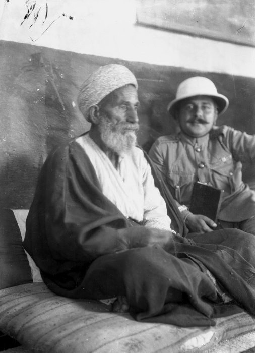 01 המוכתר של הכפר ג'יליה, לידו יושב ד"ר אלקן חובש כובע פקק, 1926