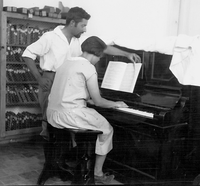 23 לוטי מנגנת בפסנתר ורודולף מעביר את דפי תוואי הנגינה. חולדה, 1926