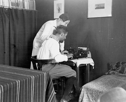 24 רודולף ולוטי ליד מכונת כתיבה. נחלת יעקב, 1926