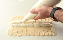 2. מזלפים בעזרת שקית זילוף או מורחים את מילוי הגבינה במרכז המלבן. סוגרים את הבצק מעל המילוי תוך הידוק הרצועות זו מעל זו משמאל לימין.