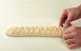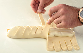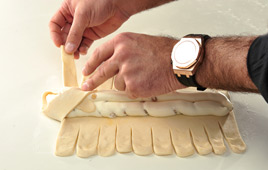 1. מרדדים את הבצק על משטח מקומח למלבן בגודל 20*30 ס"מ. חותכים לאורכו של המלבן, משני הצדדים, 10 חתכים לפחות באורך 5 ס"מ לכיוון המרכז.