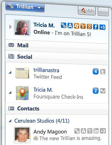 טריליאן מוכרת כבר הרבה שנים והיא אחת התוכנות הנאות והמקצועיות ביותר מבין החבורה ואפילו תומכת בעברית. טריליאן תומכת בשירותים הבאים: Trillian Account Windows Live™ ,Yahoo!®, Facebook Chat, AIM™, Google™ Talk, ICQ®, MySpaceIM, Jabber / XMPP