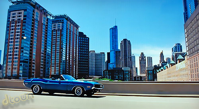 הרכב האמריקאי, עליו נוהג השחקן וינס ווהן בסרט "הדילמה" מבריק בצבעו הכחול על המסך, על רקע זכוכיות גורדי השחקים מאחור.