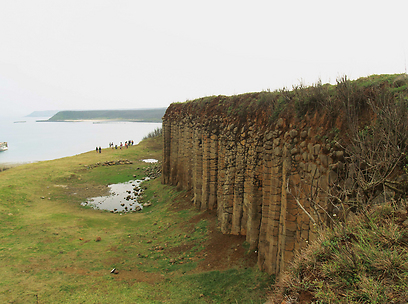 קיר עמודי הבזלת באי סיו. האתר הארכאולוגי מושך תיירים מכל העולם