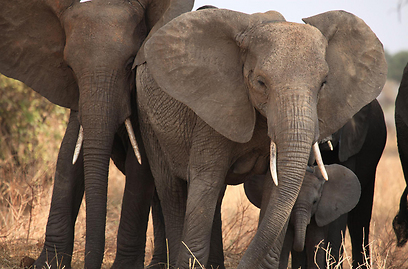 עדר פילים מגונן על הגור בשמורת טרנג'ירה