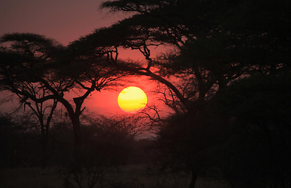 השמש שוקעת בין עצי השיטה במישורי הסרנגטי