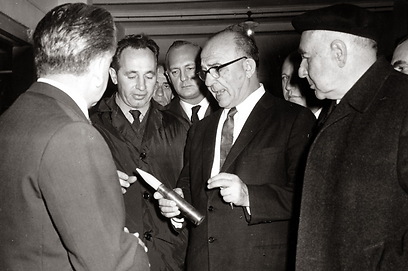 9. ראש הממשלה לוי אשכול, וראשי מערכת הביטחון: שמעון פרס, ואשר בן-נתן, לימים מנכ"ל המשרד, עם צבי דר.