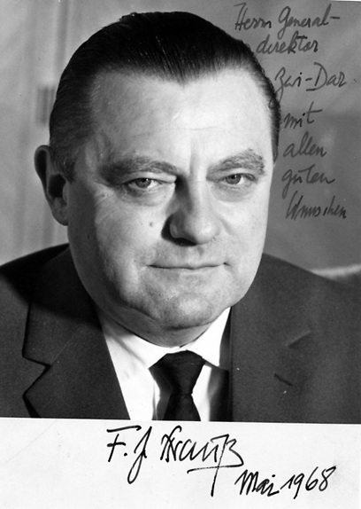 8. איכות התוצרת של תע"ש, עמידה במחירים ובזמני הספקה וקשרים אישיים אותם יצר צבי עם הגורמים הנכונים באירופה הביאה את התע"ש לייצא את התמ"ק עוזי למדינות נאט"ו בהן הייתה כבר תעשיית נשק משוכללת כמו FN הבלגית, להולנד ולגרמניה שם מצא פרנץ את פרנץ. כמה ששפה משותפת עוזרת. בתצלום: הקדשה של פרנץ יוזף שטראוס, שר הביטחון הגרמני ומגדולי ידידיה של ישראל שהביא לחיזוק צה"ל לפני מלחמת ששת הימים, לפרנץ לדרר - צבי דר.