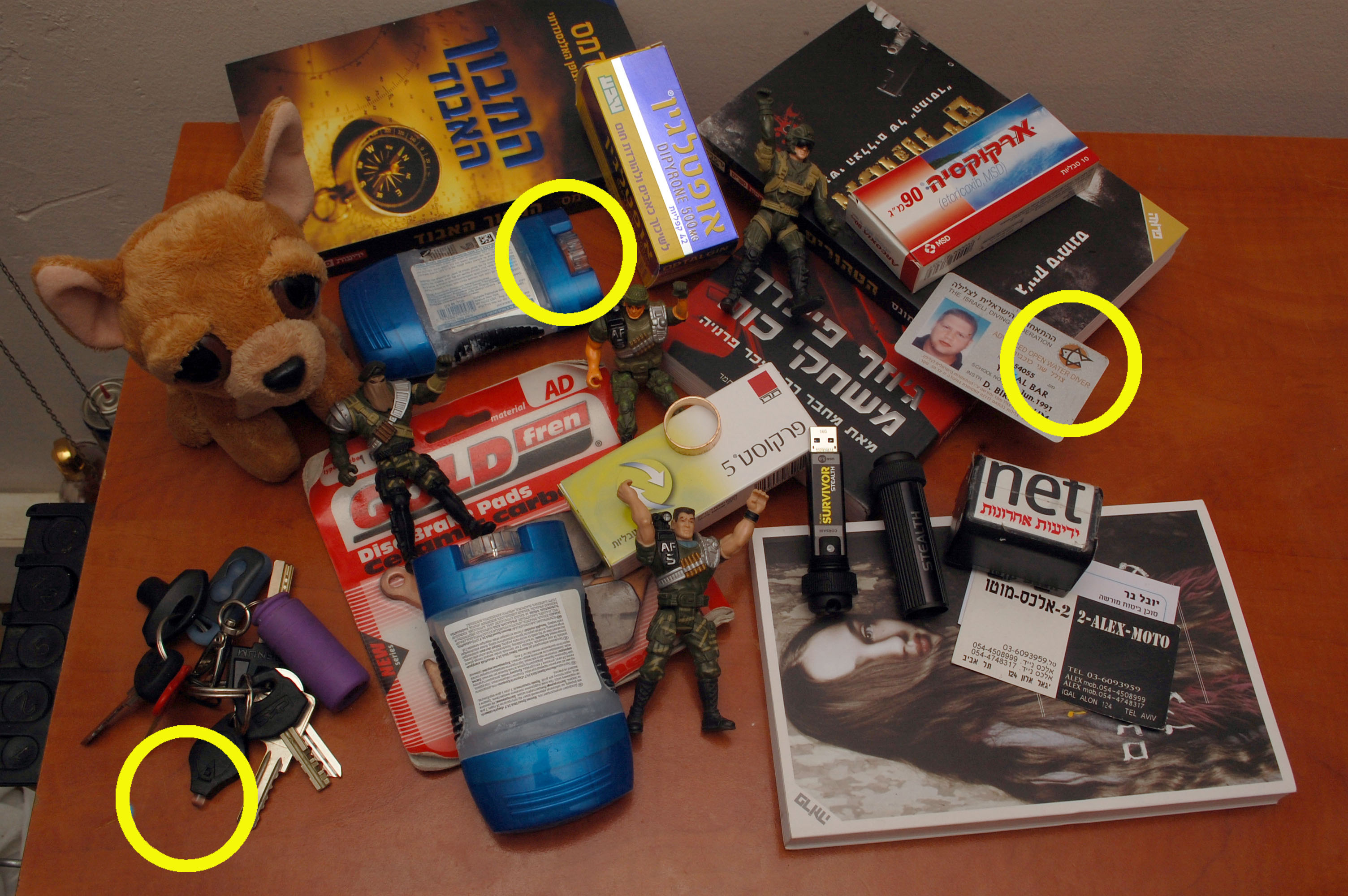 הפותר היחיד נכונה השבוע הוא מר דוד יסינובר מקדרון, שכתב בצורה הכי מדויקת את התשובה ושימו לב כמה הוא מקצוען: "1. בסמל ההתאחדות הישראלית לצלילה חסרה עין של הדג וארבעת המשולשים בדג סנפירים אמורים להיות בצבע הרקע חום 2. בדיאודורנט ג'ל ליד האופטלגין חסר את בורג הסיבוב הלבן בתחתית המיכל לשם הוצאת ג'ל 3. בצרור המפתחות פנס הלד השחור, מוטה מטה, כפתור ההפעלה במצב דלוק והנורת לד חסרה אינה דולקת". כל הכבוד דוד!