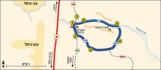 הטיול מתחיל מחניון שמורת נחל מערות עם שביל מסומן בירוק היוצא לכיוון דרום ועובר למרגלות פתחי מערות האדם הקדמון. לאחר 300 מטרים במקביל לכביש חיפה תל אביב הישן, פונים מזרחה ושמאלה (2) אל שביל מסומן בכחול המטפס במעלה הרכס.