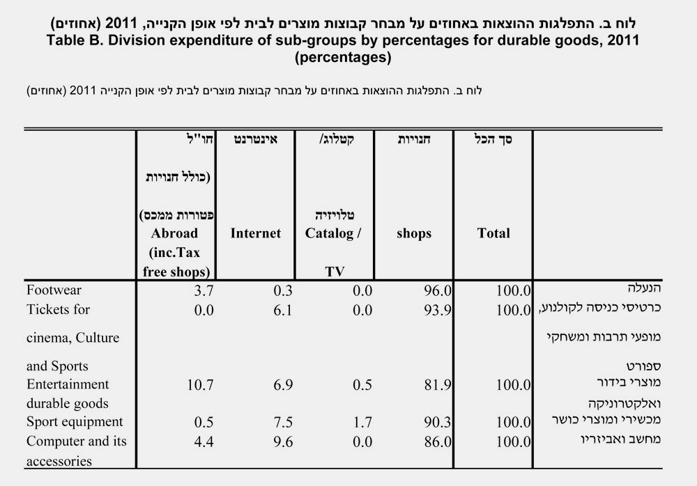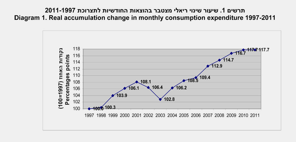 נתוני הלמ"ס ל-2011: ההוצאה החודשית למשק בית בישראל עמדה על 13,967 שקל בממוצע. מדובר בעלייה של 3.4% לעומת 2010. ההוצאה על דיור גדלה ב-3.6%, ועמדה על 3,500 שקל לחודש. שיעור משקי הבית שבבעלותם מנוי לכבלים או ללוויין ירד לכ-62%, לעומת 73% לפני עשור