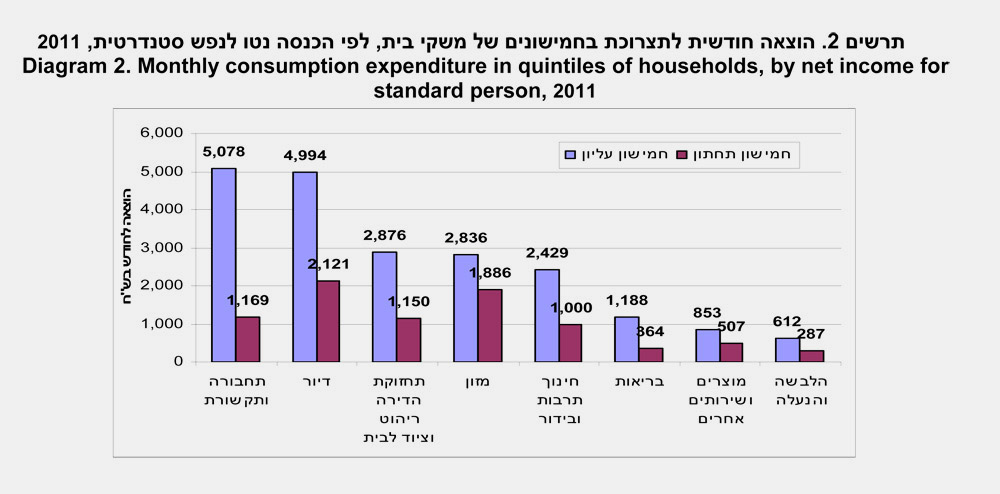 משקי בית מחמישון השכר העליון (20% ממשקי הבית שבהם נמדדה ההכנסה הגבוהה ביותר) הוציאו ב-2011 פי 4.3 ממה שהוציאו משקי בית מהחמישון התחתון על תחבורה ותקשורת. הם הוציאו פי 3.3 על בריאות ופי 2.4 על חינוך, תרבות ובידור.