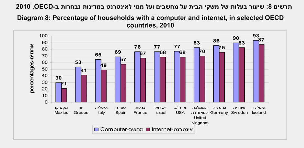 נמצא, כי ל-94.3% ממשקי הבית בעשירון העליון יש מחשב בהשוואה ל-55.8% בעשירון התחתון. מנוי לאינטרנט יש ל-91.4% ממשקי הבית בעשירון העליון בהשוואה ל-38.6% בעשירון התחתון.