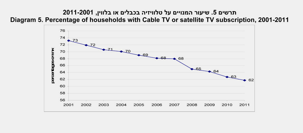שיעור משקי הבית שבבעלותם היה מנוי לחברת כבלים או לוויין ירד מ-73.2% ב-2001 ל-61.8% ב-2011. במקביל, עלה השיעור משקי הבית שבבעלותם צלחת לווין או ממיר דיגיטלי, ל-17.3% ו-22% בהתאמה.