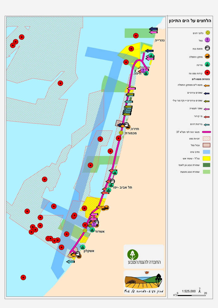 החברה להגנת הטבע ריכזה במפה אחת את עשרות האינטרסים והלחצים המאיימים על חופי הים התיכון של מדינת ישראל, ביניהם קידוחים, ברכת דגים, שפכי תעשייה וביוב, מרינות, מתקני התפלה ושטחי אש של צה"ל