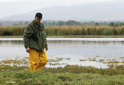 15 נובמבר, 2011, שמורת החולה. פקח השמורה מזה עשרים שנה, יורם מלכה, מאיץ את רכב השטח הקטנטן בשבילי השמורה שאינם נגישים למבקרים.