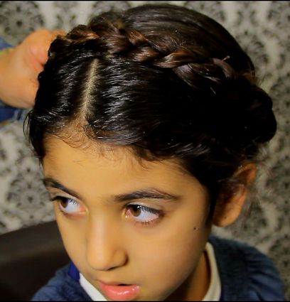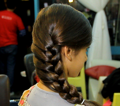 הרימו את הצמה השמאלית והניחו אותה על הצמה הימנית, כך שהקצה שלה יהיה מונח מאחורי אוזן ימין. חברו את הצמה באמצעות סיכת שיער.