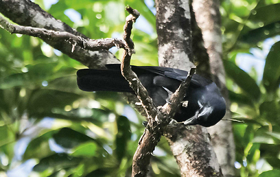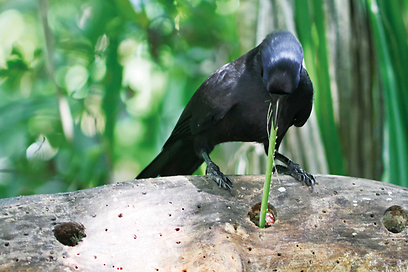 עורב קלדוני מחזיק במקורו את הוו שהכין כדי לשלוף את מזונו. עורבים מסוג זה הם בעלי החיים היחידים (פרט לאדם) שיודעים ליצור קרסים לשליפת מזון מחורים. (צילומים: גאווין האנט, אוניברסיטת אוקלנד)