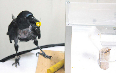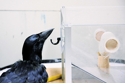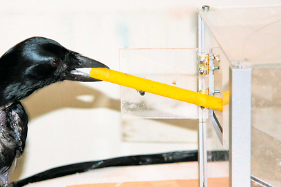 עורב שולה מזון ממבחנה באמצעות קרס שהוא יצר בעצמו