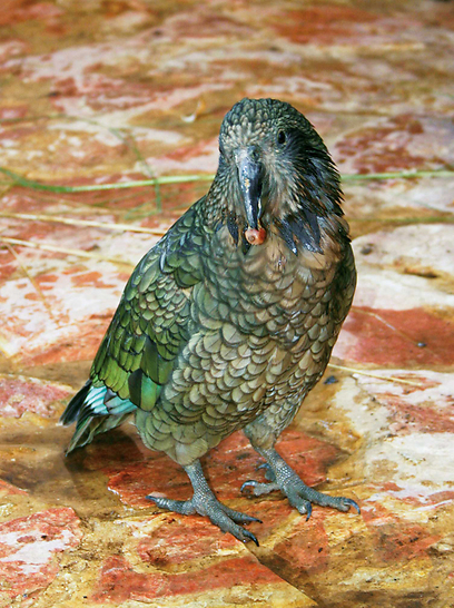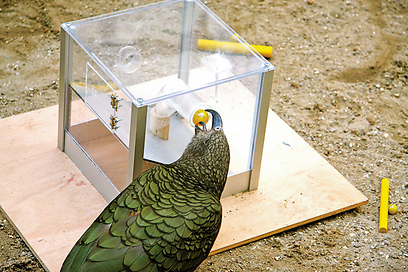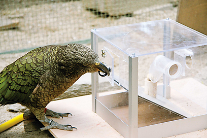 קיאה (מין תוכי טורף מניו זילנד) משתמש בכדורים ומוטות פלסטיק שהועמדו לרשותו כדי לפתור בעיה שעל פי פתרונה, הוא מקבל פרס. השלב הראשון בפתרון הבעיה - פתיחת החלון שדרכו ניתן להגיע לפרס - מתבצע על ידו בקלות רבה (צילומים: auersperg et el 2011)