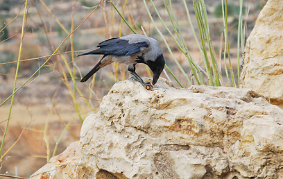 עורב מפצח אגוז פקאן. העורבים האפורים, המוגדרים על פי החוק כמזיקים (על אף שתרומתם האקולוגית כסניטרים גבוהה בהרבה מהנזק שהם מסבים), ידועים מאוד בכחמתם ובנקמנותם. בין השאר הם נצפו משליכים פקאנים לכביש כדי שמכונית תרסק את קליפתם (צילום: אודי רן)