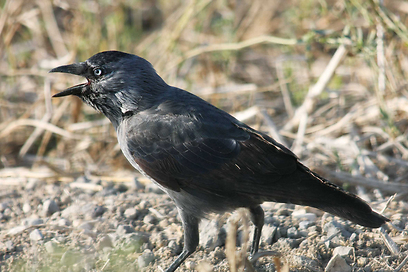 קאק, עורב קטן הידוע בחכמתו. האתולוג קונרד לורנץ, בספרו הנודע "טבעת המלך שלמה", מציין כי לקאקים הייררכיה ברורה, נוהלי "נישואין" מיוחדים ותקשורת מורכבת (צילום: חיים מויאל)