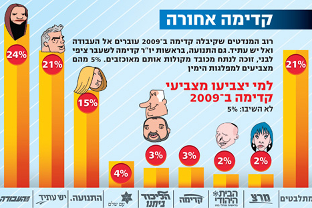רוב המנדטים שקיבלה קדימה ב-2009 עוברים אל העבודה ואל יש עתיד. גם התנועה בראשות ציפי לבני זוכה לנתח מכובד מקולות אותם מאוכזבים. 5% מהם מצביעים למפלגות הימין.