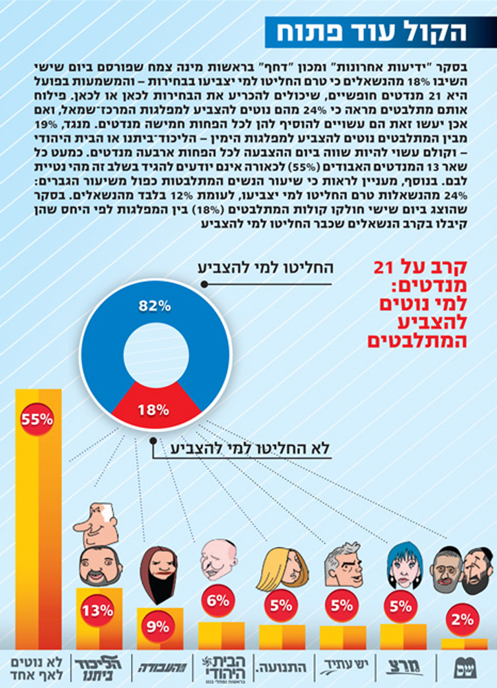 בסקר שפורסם ביום שישי התברר כי 18% מהנשאלים טרם החליטו למי להצביע. המשמעות בפועל היא - 21 מנדטים חופשיים שיכולים להכריע את הבחירות לכאן או לכאן. פילוח אותם קולות מעלה כי 24% מהם נוטים להצביע למפלגות המרכז-שמאל, ואם אכן יעשו זאת הם עשויים להוסיף להן לפחות חמישה מנדטים.